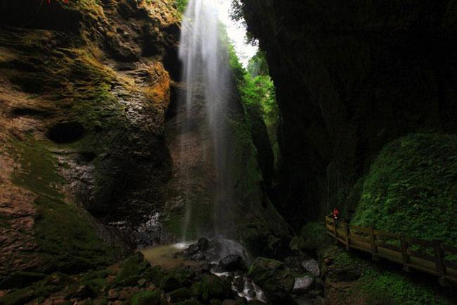 中国南方喀斯特世界自然遗产核心景区,中国国家地质公园。经几千万年前造山运动而形成,属典型喀斯特地貌景观。地缝形如其名,就像地球裂开一道深邃的缝 隙,谷底最窄处只一米之遥,最宽处也不足十米,缝口与谷底之间高达350余米,谷底溪水孱孱,清澈见底。峡谷两岸如刀劈斧削一般,即使正午时分,阳光也难 达谷底,漫游其间,仿佛置身地球深处探幽,犹若在时空隧道中穿行。景区玲珑秀丽,风光优美,以峡深壁立、原始植被、飞瀑泉流、急流深潭为其特色,是一处很 好的生态旅游和探险旅游风景区。