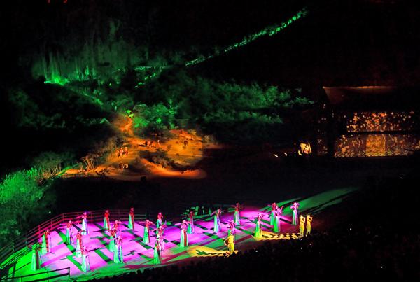 “印象·武隆”实景歌会由印象“铁三角”张艺谋任艺术顾问,王潮歌、樊跃任总导演,100多位特色演员现场真人真情献唱,以濒临消失的“号子”为主要内容,让观众在70分钟的演出中亲身体验自然遗产地壮美的自然景观和巴蜀大地独特的风土人情。