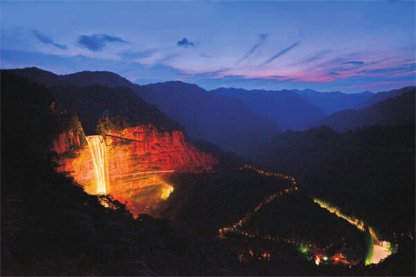 望乡台瀑布高158米,宽48米,是我国迄今为止发现的单级落差最大的宽幅瀑布,有“华夏第一高瀑”、“中国最美十大瀑布”的美誉。瀑布周围环绕丹霞画壁,整体轮廓酷似心形,是全球最大的自然形成的瀑布类心型丹霞景观,也被誉为“天下第一心”。同时,望乡台瀑布通过采用国际先进的声光电技术,成为了我国首个可供游客夜间观赏的大型瀑布景观。