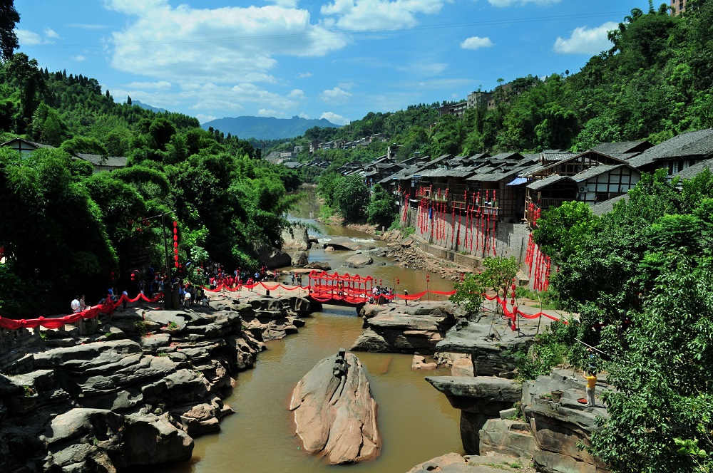中山古镇是中国历史文化名镇,可考历史863年,自古以来就是贸易繁荣的水陆码头。它依山临水而建,整条街自南向北,沿笋溪河延伸,现保存完好的铺面有307间,全长1132米。整条老街以青石板铺设的街面为轴,东西两排而走,街面宽3至5米,建筑物为穿斗式木结构或穿斗式和抬梁式混合结构,采用吊脚楼式建筑。整条街有晴不漏光、雨不湿鞋、冬暖夏凉的特点,被民俗建筑专家评为西南地区规模最大、保存最完好、最具有民族特色的山地民居古建筑群。