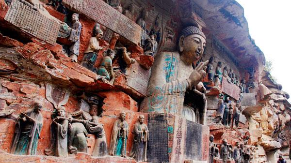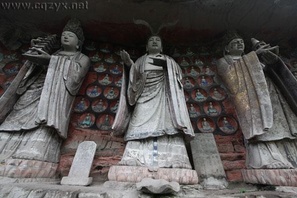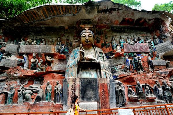 大足石刻群有石刻造像70多处,总计10万多躯,其中以宝顶山和北山摩崖石刻最为著名,其以佛教造像为主,儒、道教造像并陈,是中国晚期石窟造像艺术的典范,规模之宏大,艺术之精湛,内容之丰富,可与敦煌莫高窟、云冈石窟、龙门石窟齐名。
