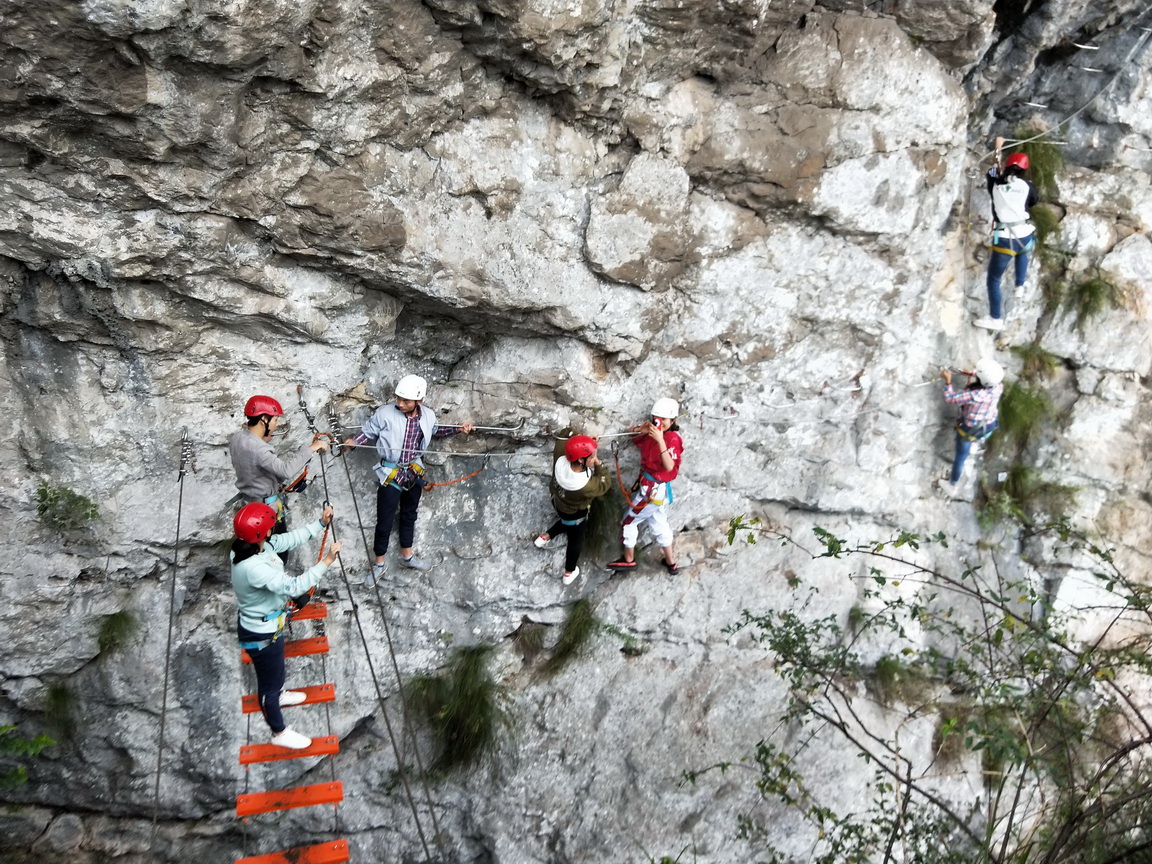 飞拉达也是悬崖攀岩项目之一,全长280米,沿着山脊间或岩壁上事先设置好的铁扶手、横梯、悬桥、固定缆索、岩石塞等构成的爬山径道进行攀爬,让平凡的你也能体验飞檐走壁的感觉。