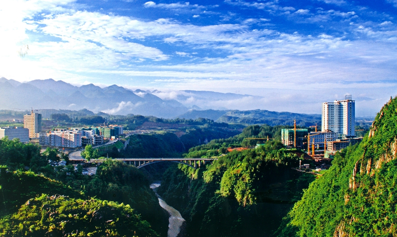 黔江城市峡谷横跨七个地质年代、垂直落差达500米,全长约8公里,拥有高达123米的巨幅摩崖观音像和悬空玻璃栈道。景区位于黔江城区,也成就了黔江“东方卢森堡,黔江峡谷城”的美誉。