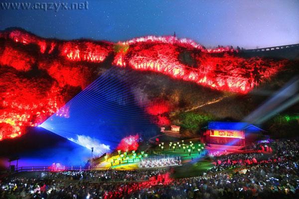 "印象武隆"实景歌会由印象"铁三角"张艺谋任艺术顾问,王潮歌、樊跃任总导演,100多位特色演员现场真人真情献唱,以濒临消失的"号子"为主要内容,让观众在70分钟的演出中亲身体验自然遗产地壮美的自然景观和巴蜀大地独特的风土人情。