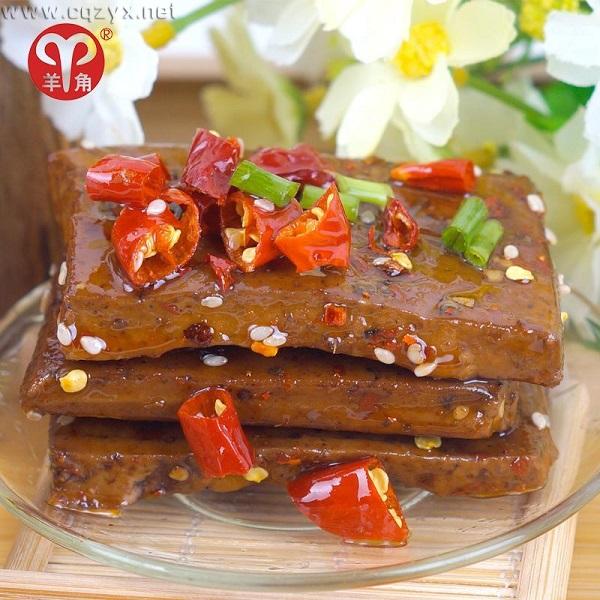 “羊角豆腐干”的制作,以前全用传统的方法进行手工加工。其原料多为武隆境内出产的优质大豆,生产所用的水一律以当地白马山麓的龙洞水(山泉水)。产品表层色彩均呈深酱色,黑中透红,给人一种美感一种引诱。其内肉白而泛青,绵软相适,硬度适中,光滑细腻,富有弹性。其味咸淡相宜,五香俱全,营养丰富,爽而不腻,不存渣粒。软中很有嚼头,口感极佳,在人们品尝时一丝丝馥郁的豆香、药香、美味直入胃肠。