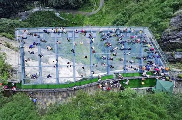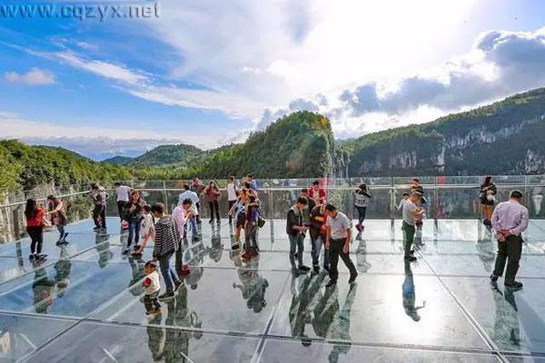 天生三桥旁的玻璃栈道。高耸入云的玻璃台,游客们站在陡峭的悬崖,释放灵魂的激情。