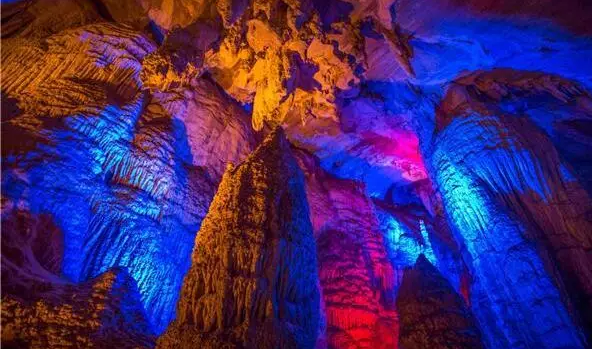 上午去了地缝,下午去芙蓉洞。芙蓉洞的钟乳石很壮观,洞内打着各种颜色的光,以蓝绿红色居多。过江速滑也是极其的惊险刺激!