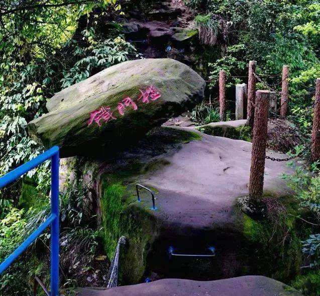再接着往前面走,看到这一个看起来像艘船船头的栏杆。这是另一景点——铁门槛,两石之间相隔约1.2—1.5米,年轻人都能一跃而过。旁边的碑文上写道:古时候王母娘娘为阻止圣灯山牧童与仙女相爱,设置了一道鸿沟来隔离两人,两人因隔岸不能相聚,遂化作两棵鸳鸯古松,分立两岸,其幼婴化作“风动石”。后人若能一跃而过,则有情人终成眷属,夫妻恩爱,举家和睦,永不分离。