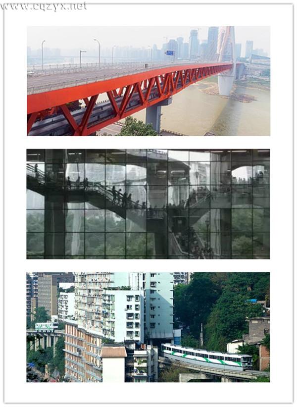 千厮门大桥轻轨6号线轨道、铜元局轻轨站镜面倒影及穿楼而过的轻轨2号线